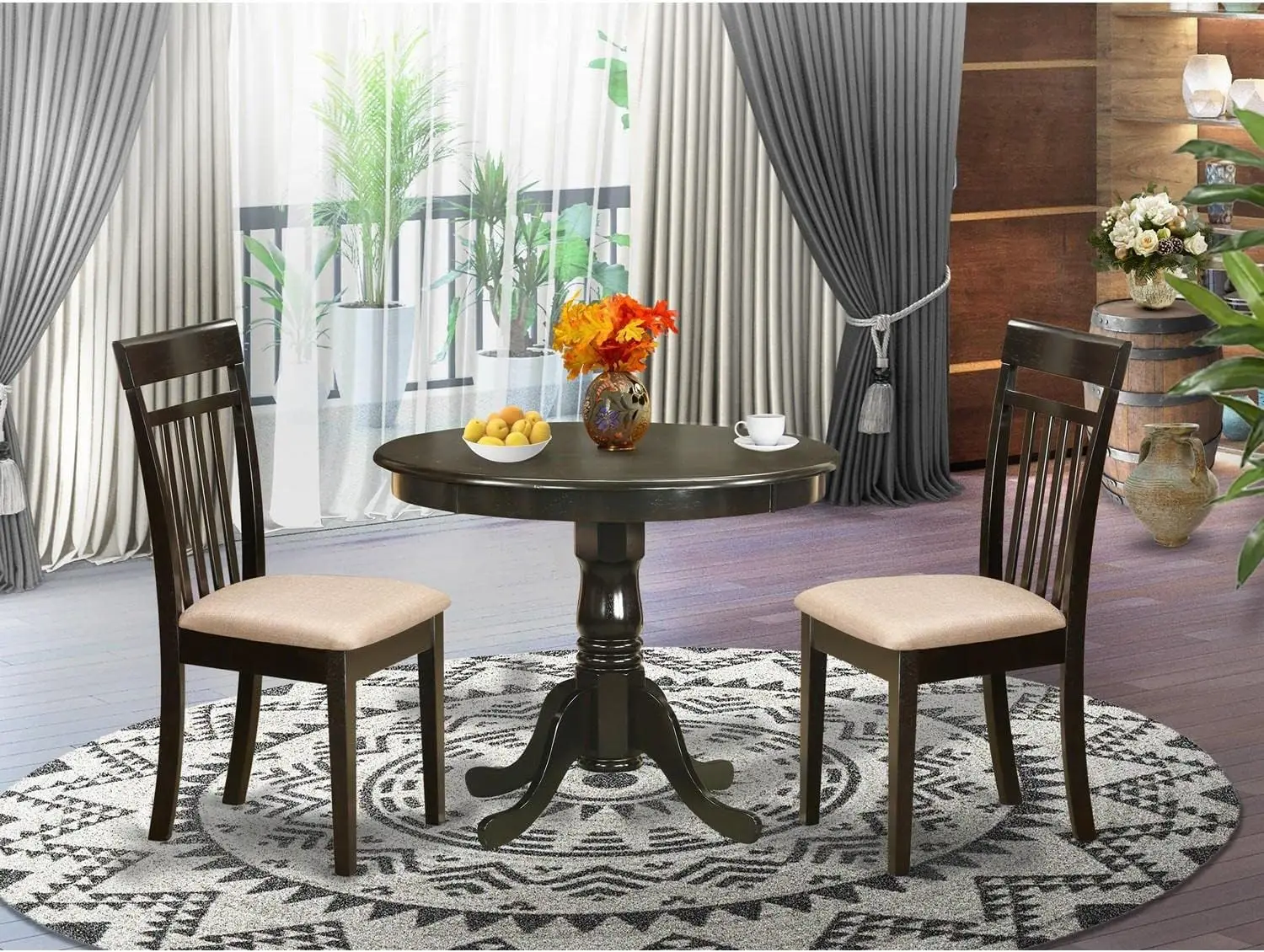 - DINING ROOM SET: Enhance the charm of your dining room with an exquisite dining set that exudes elegant style. This set comprises a round wooden table and 2 dining chairs, and it will undoubtedly elevate the aesthetics of any dining area with its timeless design. Whether you’re entertaining guests or having a cozy meal with your family, this wood dining table set is perfect for creating a sophisticated and inviting atmosphere.