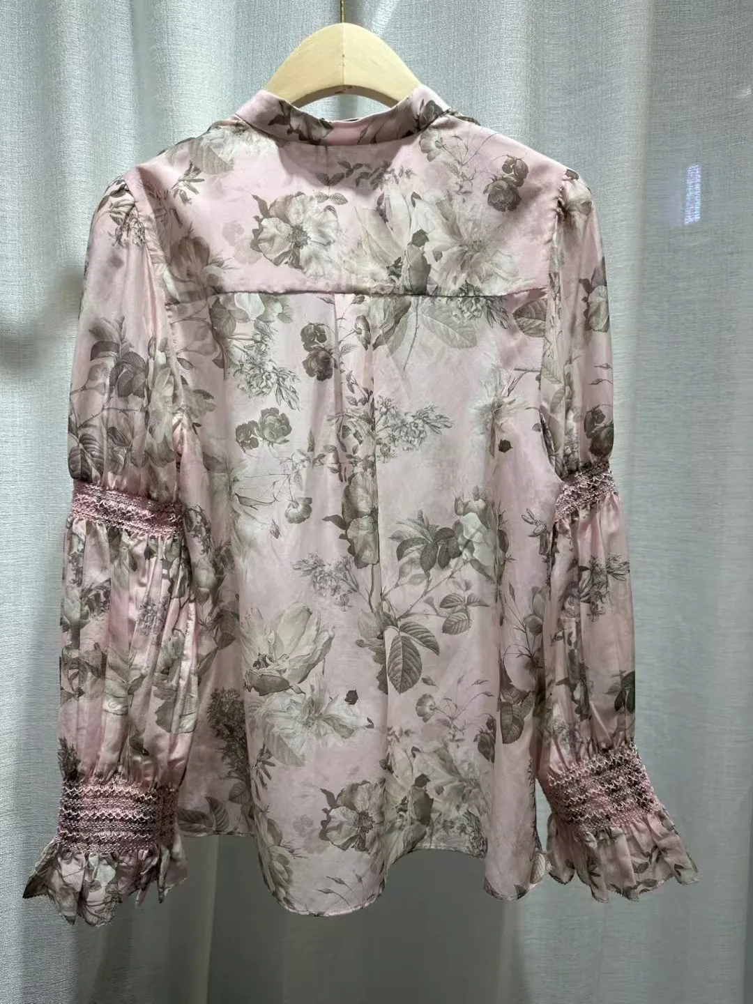 Autumn Female Flower Printed Shirt Stand Collar Single Breasted Long Sleeve Elegant Ladies Silk Cotton Blouse Top