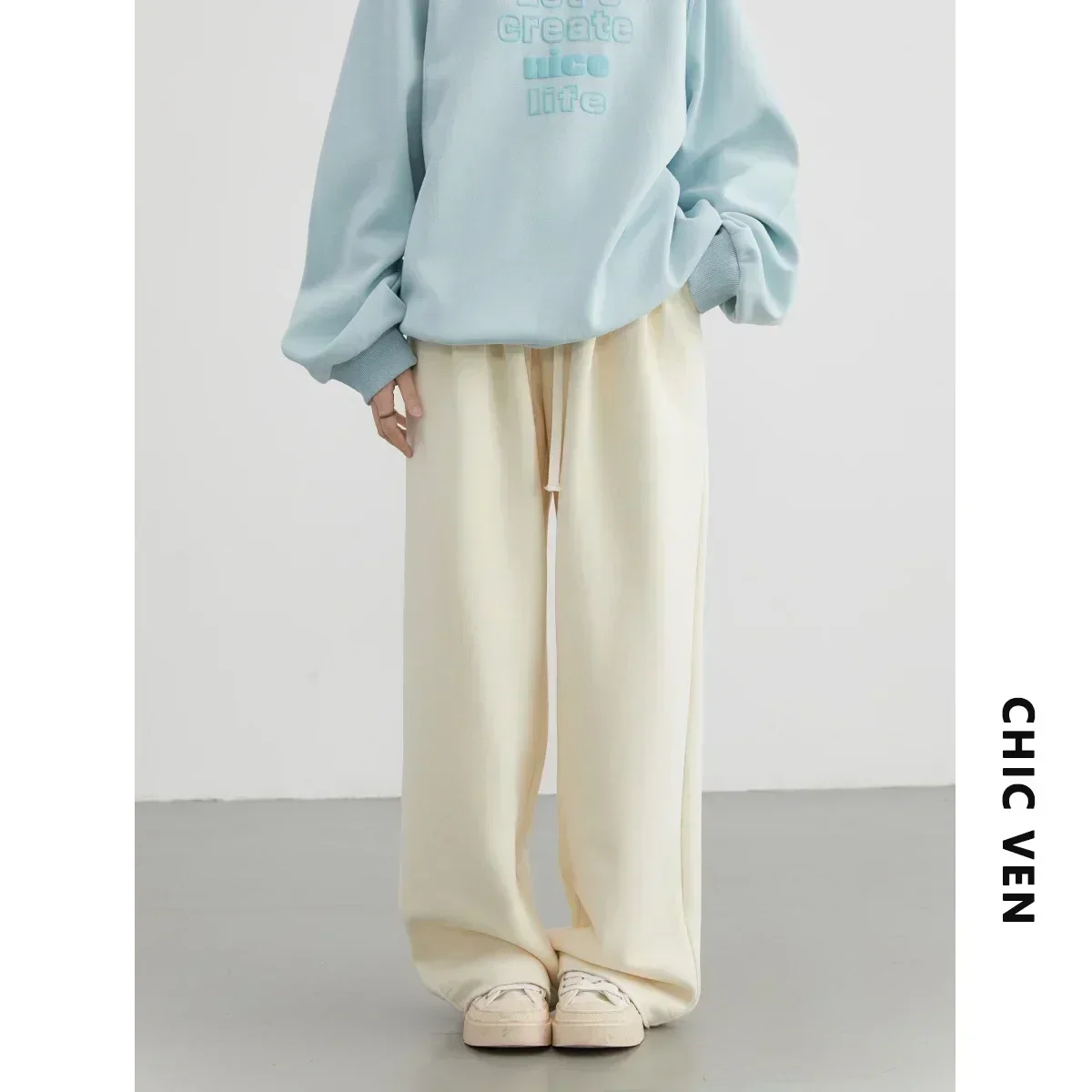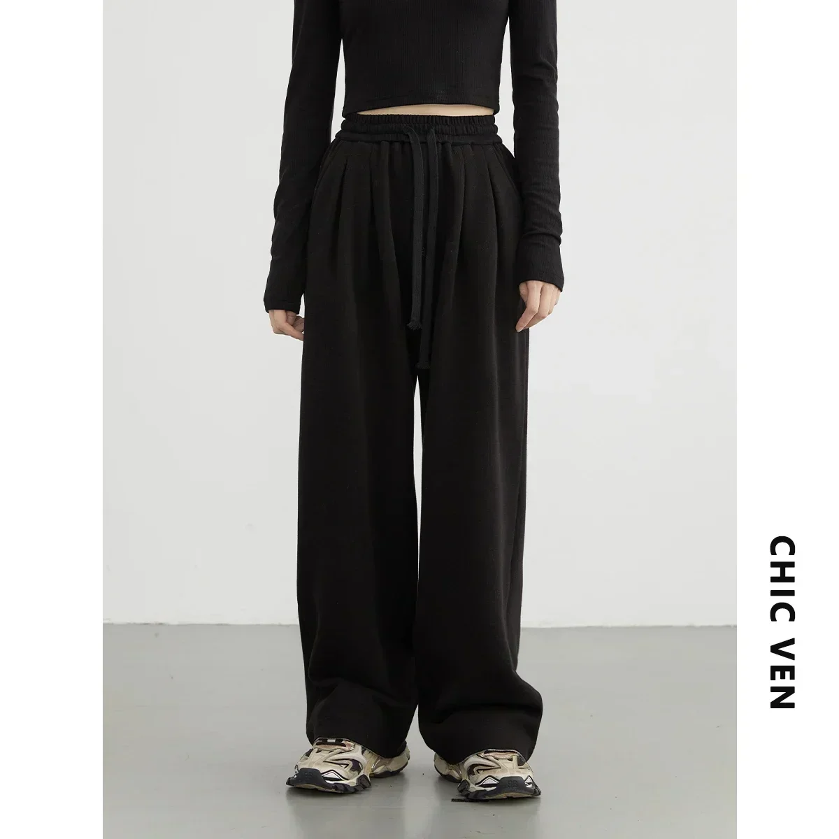 CHIC VEN Women’s Pant Streetwear Solid Loose New Drawstring Sports Casual Trousers High Waisted Pants Autumn Winter 2025