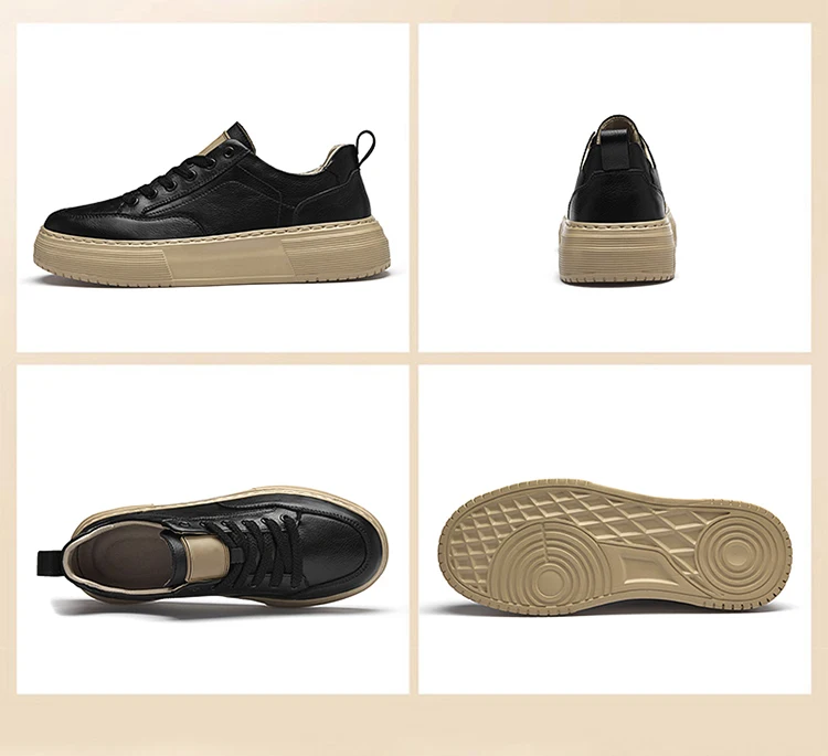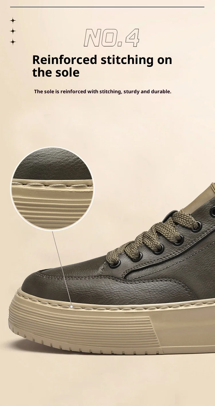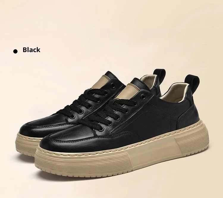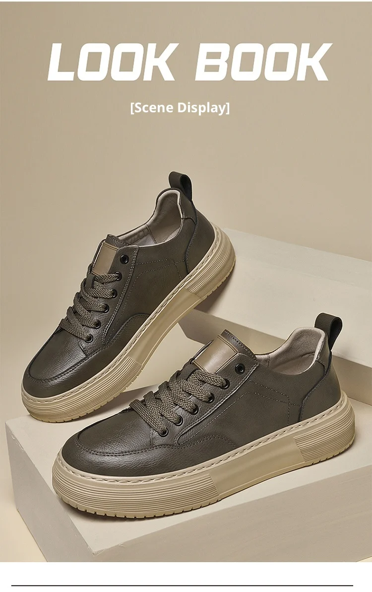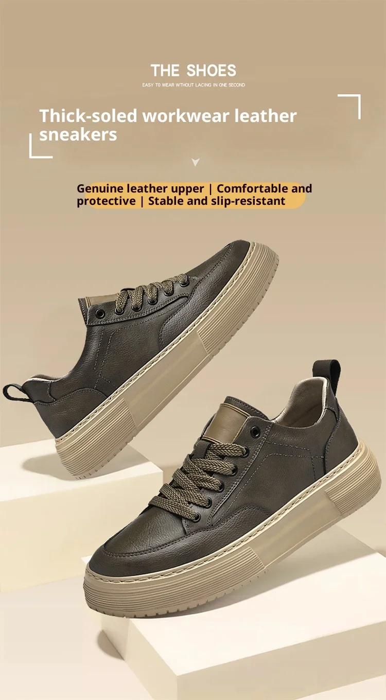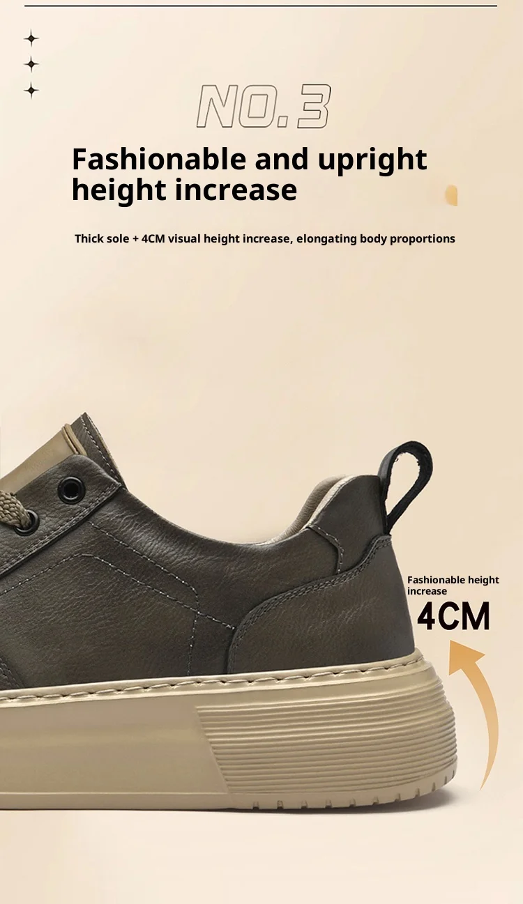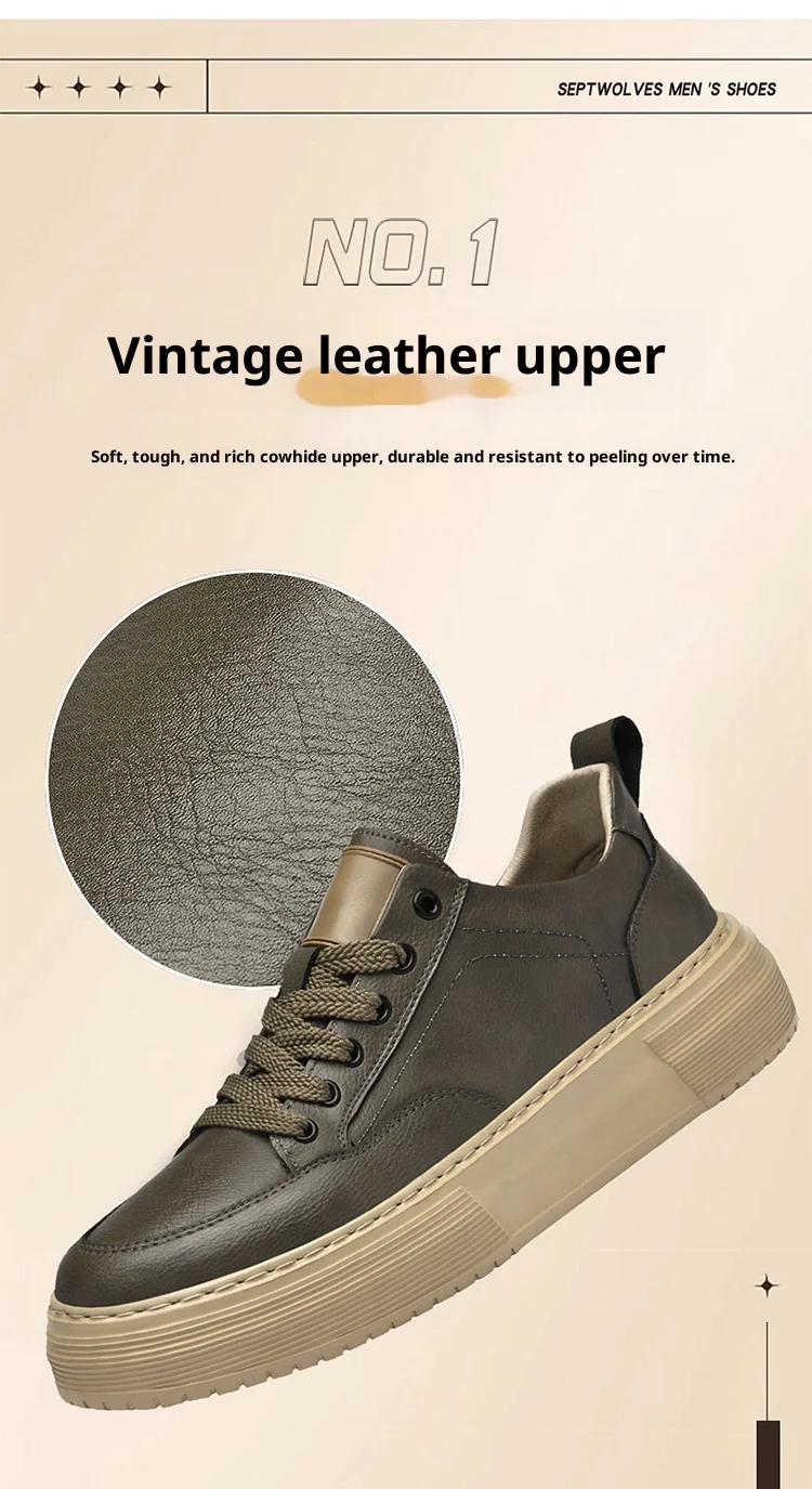 Genuine Leather Men’s Casual Shoes, Thick-soled, Anti-slip, Wear-resistant, Height-increasing, Street Fashion, Retro Board Shoes