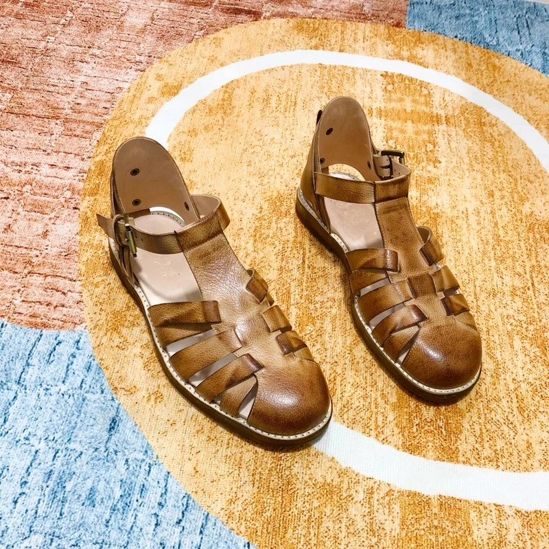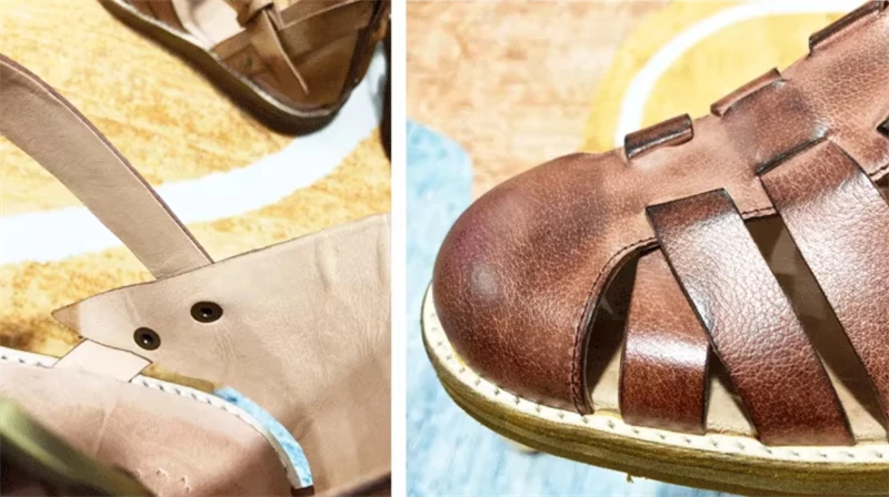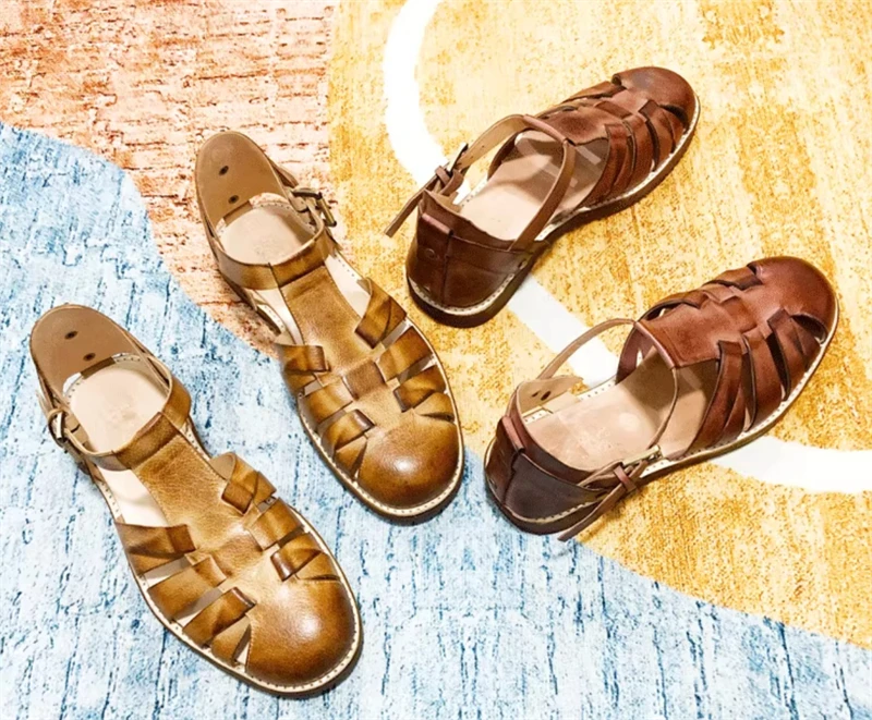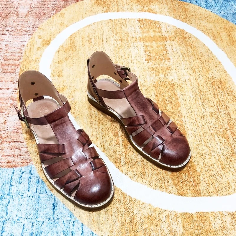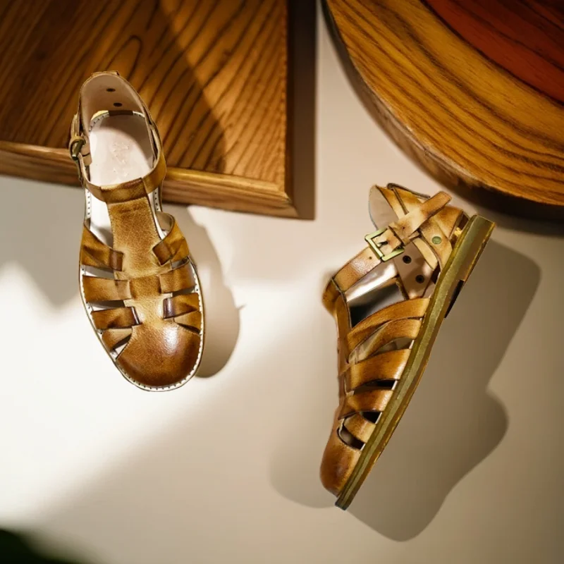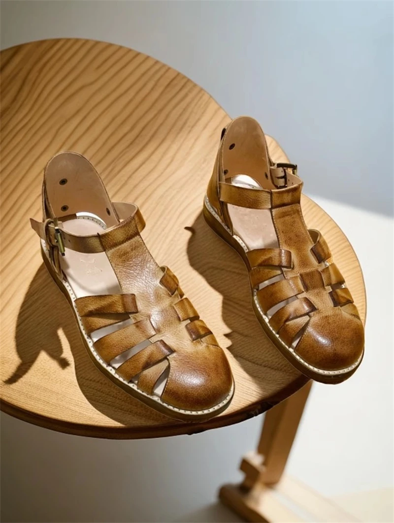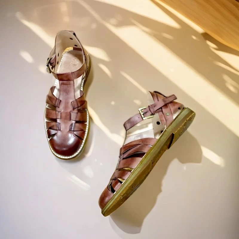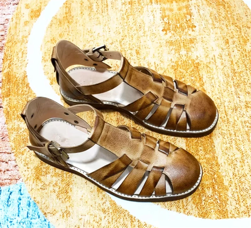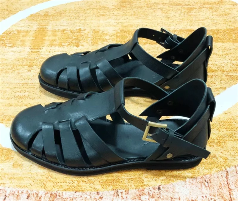 Handmade Designer Cowhide Hollowed Out Roman Sandals Men’s Genuine Leather Vintage French Aged Beach Shoes