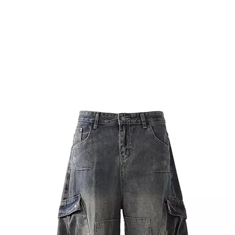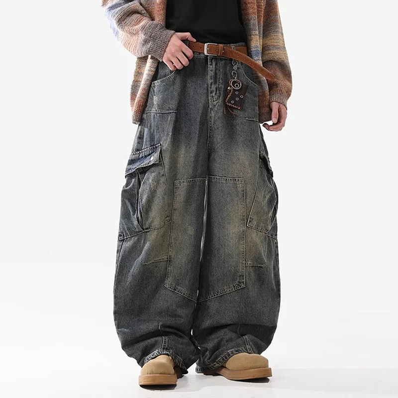 Retro Multi Pocket Curved Knife Jeans Autumn And Winter Vintage Wide Leg Workwear Pants Korean Version High Street Men’S Jeans